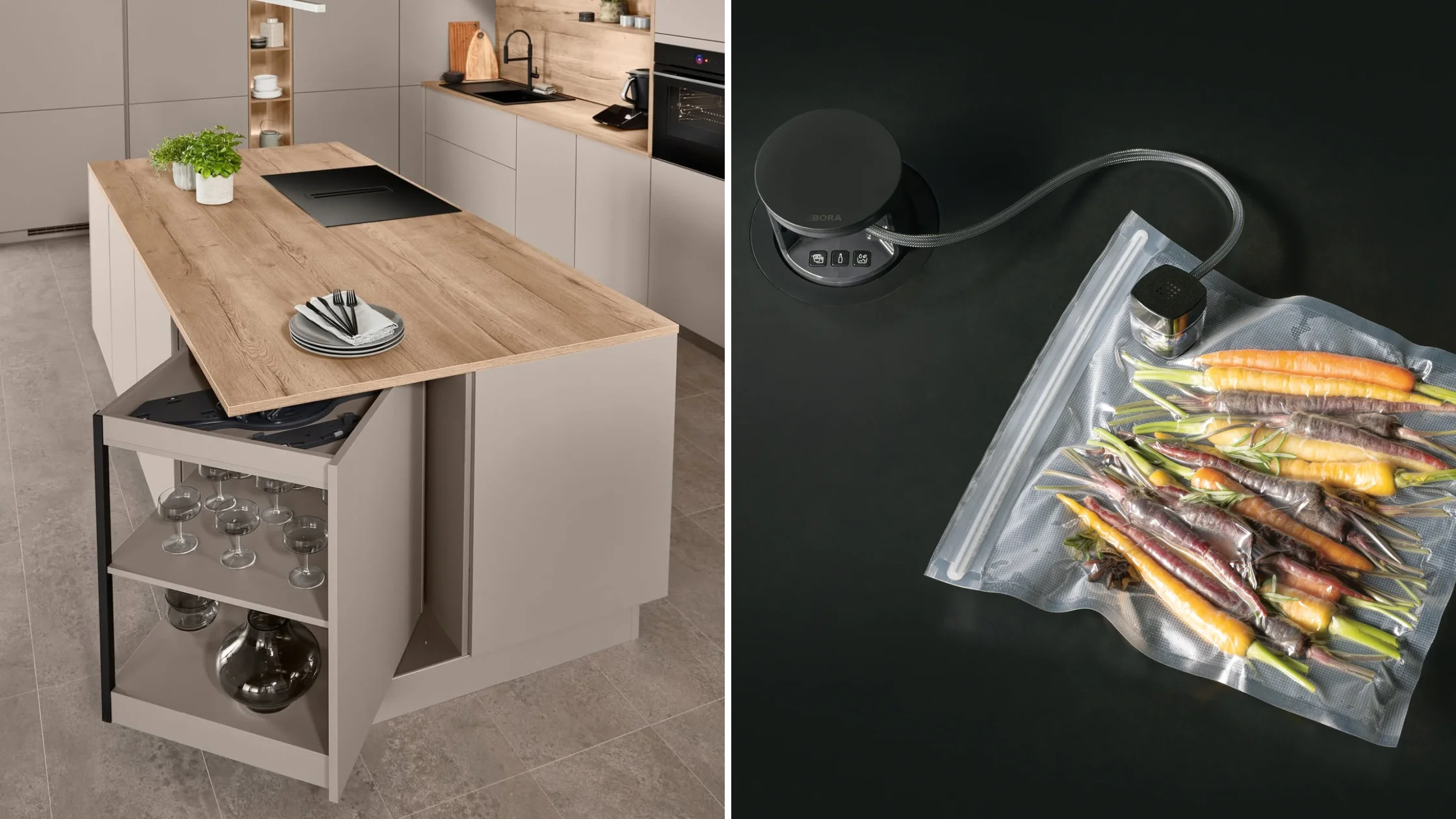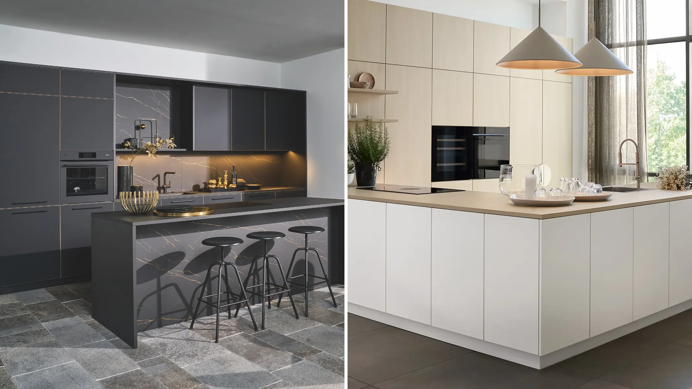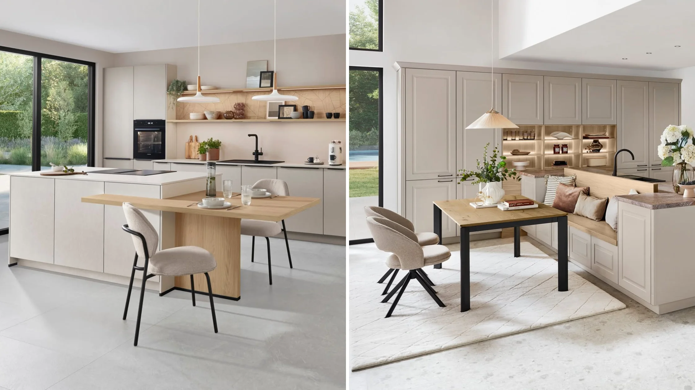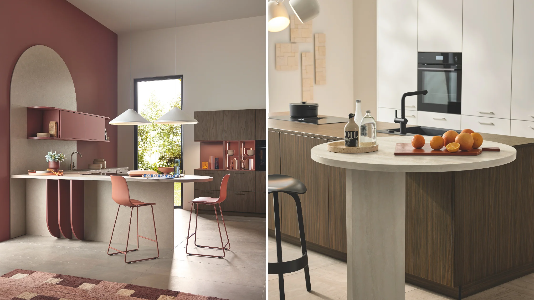 Keukeneilanden krijgen rondere vormen, open kasten lopen subtiel over in wandpanelen en handgrepen verdwijnen steeds vaker in het ontwerp.