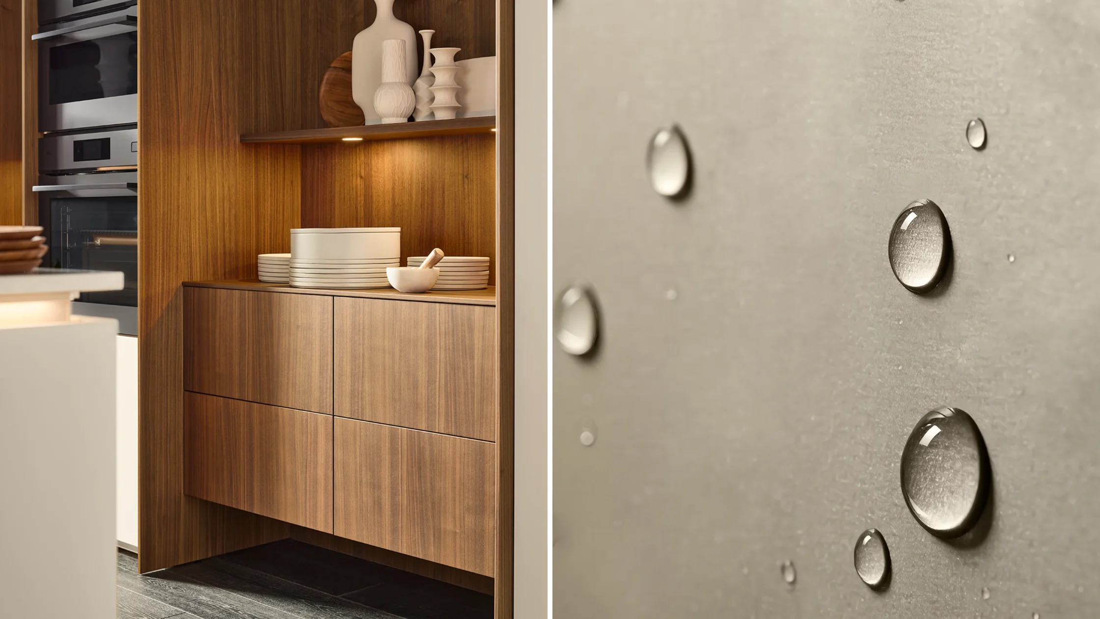 Matte coatings, voelbare houtnerven en subtiele steenstructuren geven keukens karakter en maken ze tegelijk onderhoudsvriendelijk.
