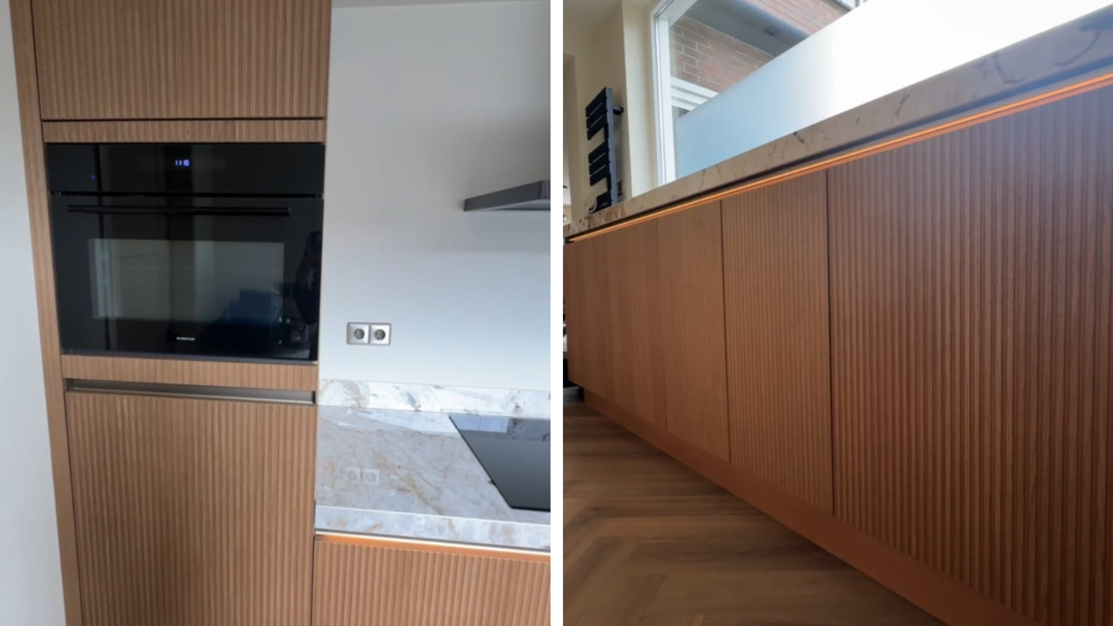 Tijdens het tweede gesprek kwamen er slimme esthetische tips bij, zoals een passtrip die precies gelijkloopt met het kastje en een strakke spatrand in plaats van tegels. Tevens werden praktische uitdagingen opgelost: het keramische werkblad bleek te groot om in één stuk geleverd te worden, maar de voeg werd slim geplaatst zodat die nauwelijks opvalt. Ook de indeling werd geoptimaliseerd. “Onze vaatwasser zat eerst midden in de keuken, totaal onlogisch. Nu zit hij helemaal rechts, waardoor we veel meer bergruimte hebben én we konden onze relatief nieuwe vaatwasser gelukkig gewoon meenemen naar onze nieuwe keuken,” aldus Chantal.