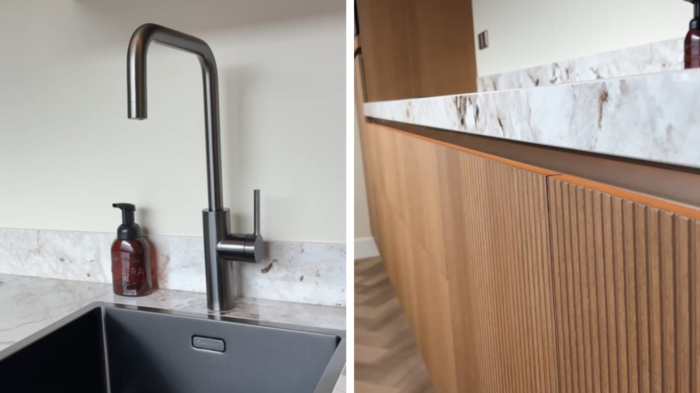 Eenmaal thuis besloten ze het hele interieur op de begane grond mee te renoveren, zodat alles perfect aansloot bij de warme, rustige Japandi-stijl van hun nieuwe keuken.