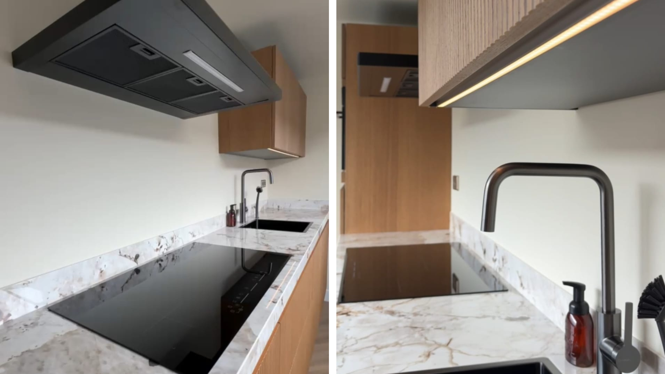 De keuken ademt de populaire Japandi-stijl, met strakke greeploze kastlijnen, mangaanbronze greeplijsten met verlichting en sfeervolle accenten zoals de LED-strip onder de vouwklep bovenkast, een gunmetal spoelbak met kraan en de perfect uitgelijnde zwarte afzuigkap en inductiekookplaat. De houtlook visgraatvloer maakt het geheel helemaal af.