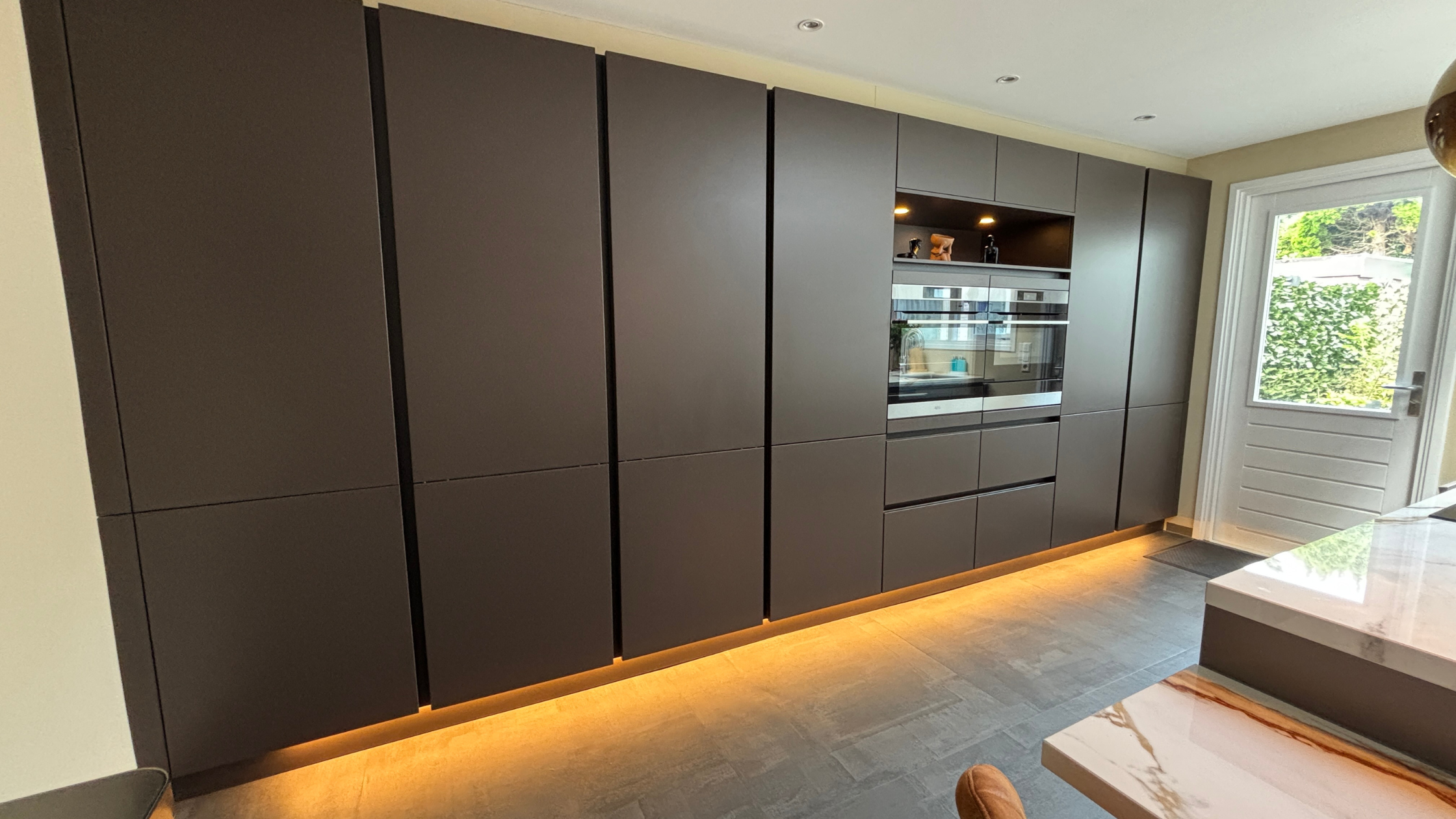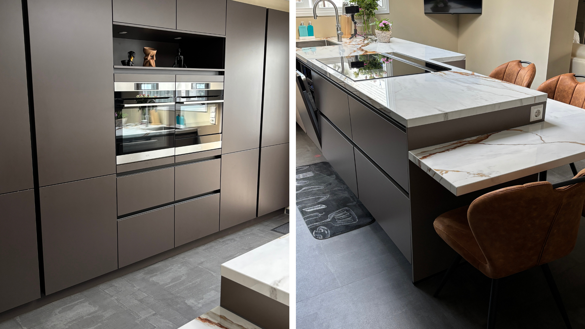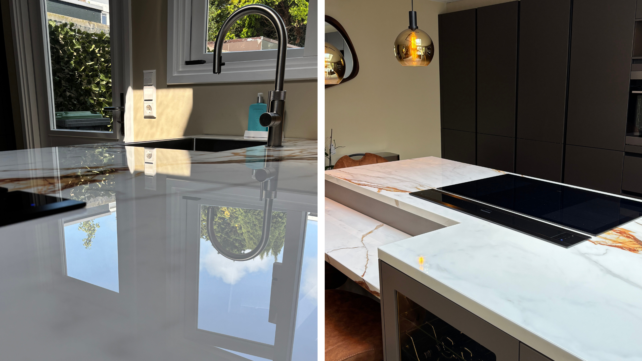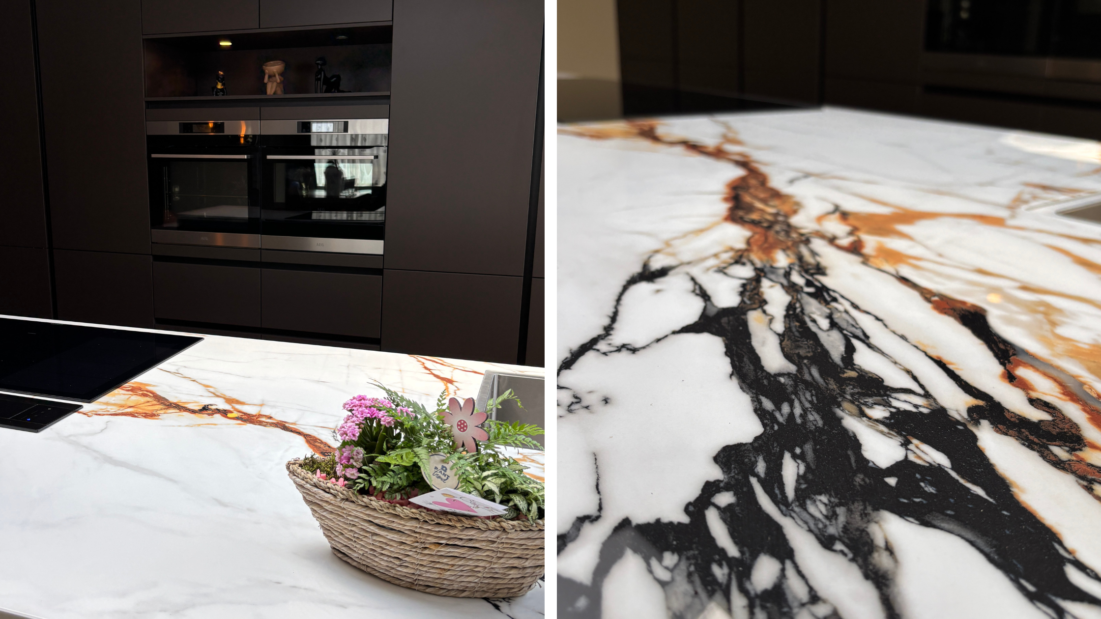 In de woning staat nu een prachtige Nolte eilandkeuken, uitgevoerd in de kleur softmat Magma, gecombineerd met een opvallend keramisch werkblad van Dekker Zevenhuizen in de kleur Spectacle. Dit werkblad springt eruit door zijn diepe, donkere basis en uitgesproken witte en goudachtige aders, wat zorgt voor een luxe en karaktervolle uitstraling.