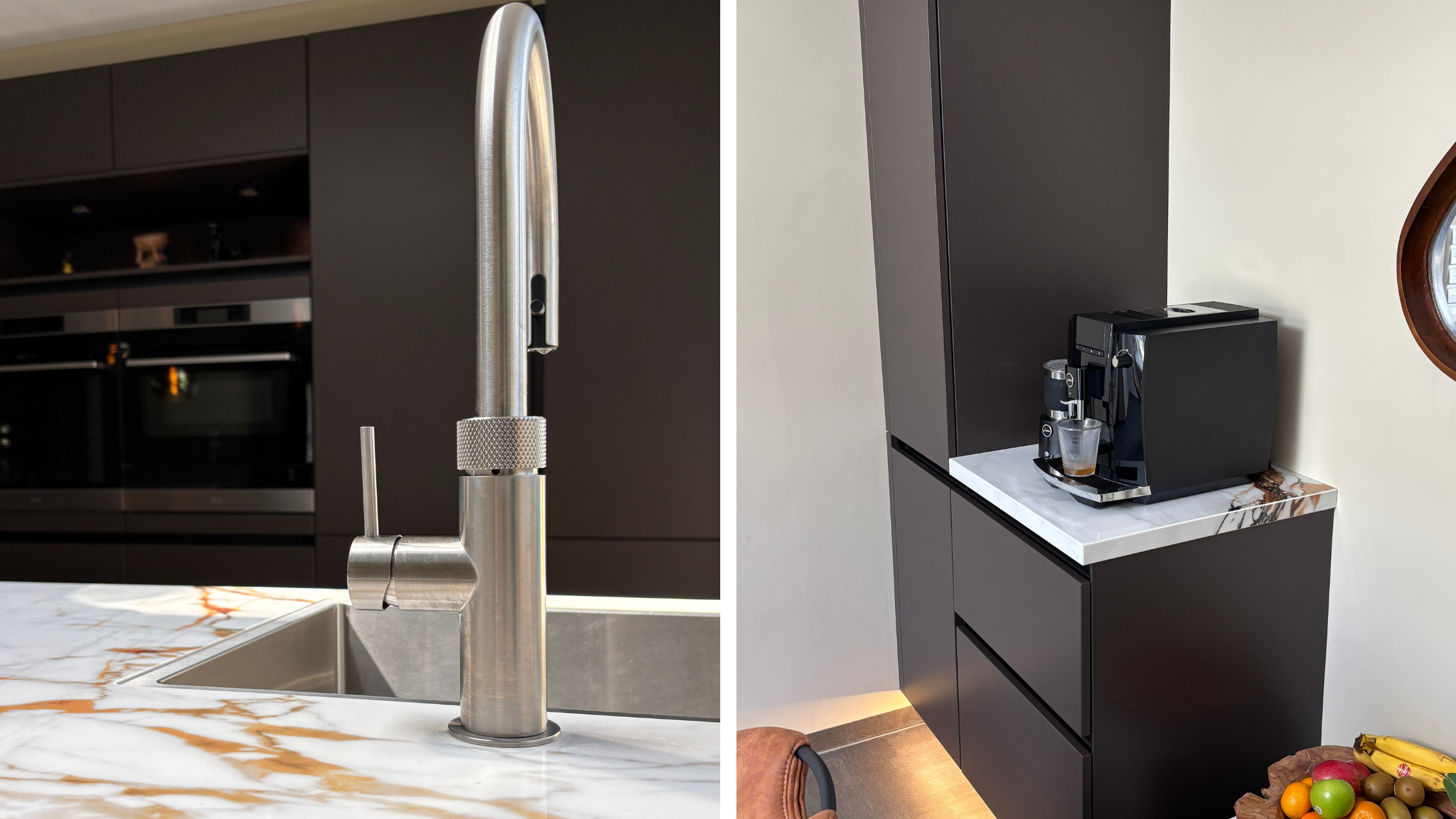 Opvallend aan de keuken is de royale hoge kastenwand met maar liefst acht fronten én een extra koffiecorner, beide uitgevoerd in de kleur softmat Sepiabruin en volledig uitgerust met luxe AEG-apparatuur. “In eerste instantie stond de koffiecorner op de plek waar nu de TV staat, maar omdat we graag een TV wilden hebben in de keuken, hebben we ervoor gekozen om de koffiecorner naar de andere hoek te verplaatsen,” vertelt meneer Pit.