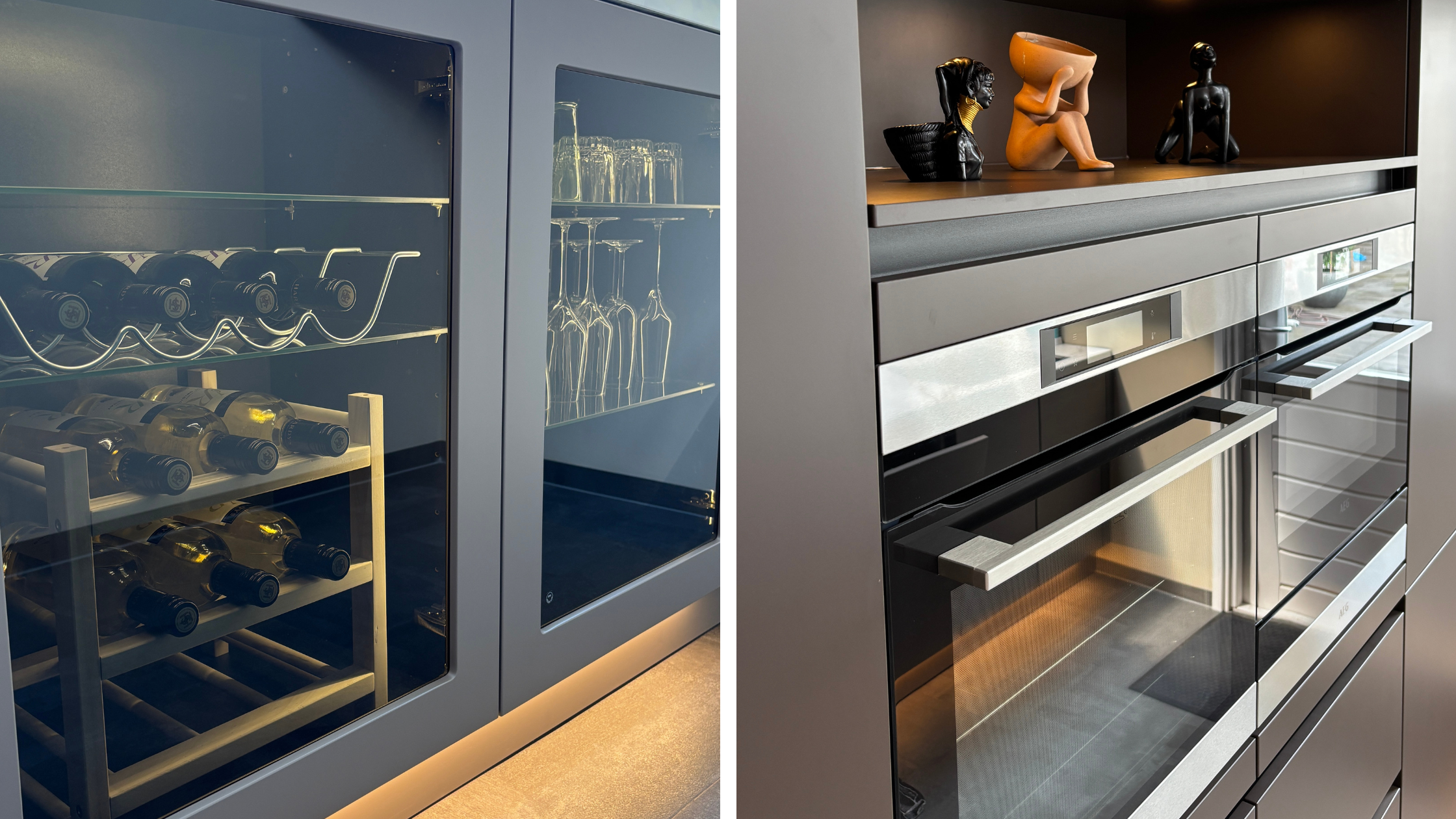Een ander bijzonder detail is de inductiekookplaat met een uitschuifbaar, verlicht glazen paneel voor kookveldafzuiging van Siemens, dat werkt volgens hun innovatieve glassdraftAir-systeem. Het verlaagde zitgedeelte aan het eiland maakt het geheel tot een sfeervolle, praktische en stijlvolle plek waar koken en samenzijn centraal staan.