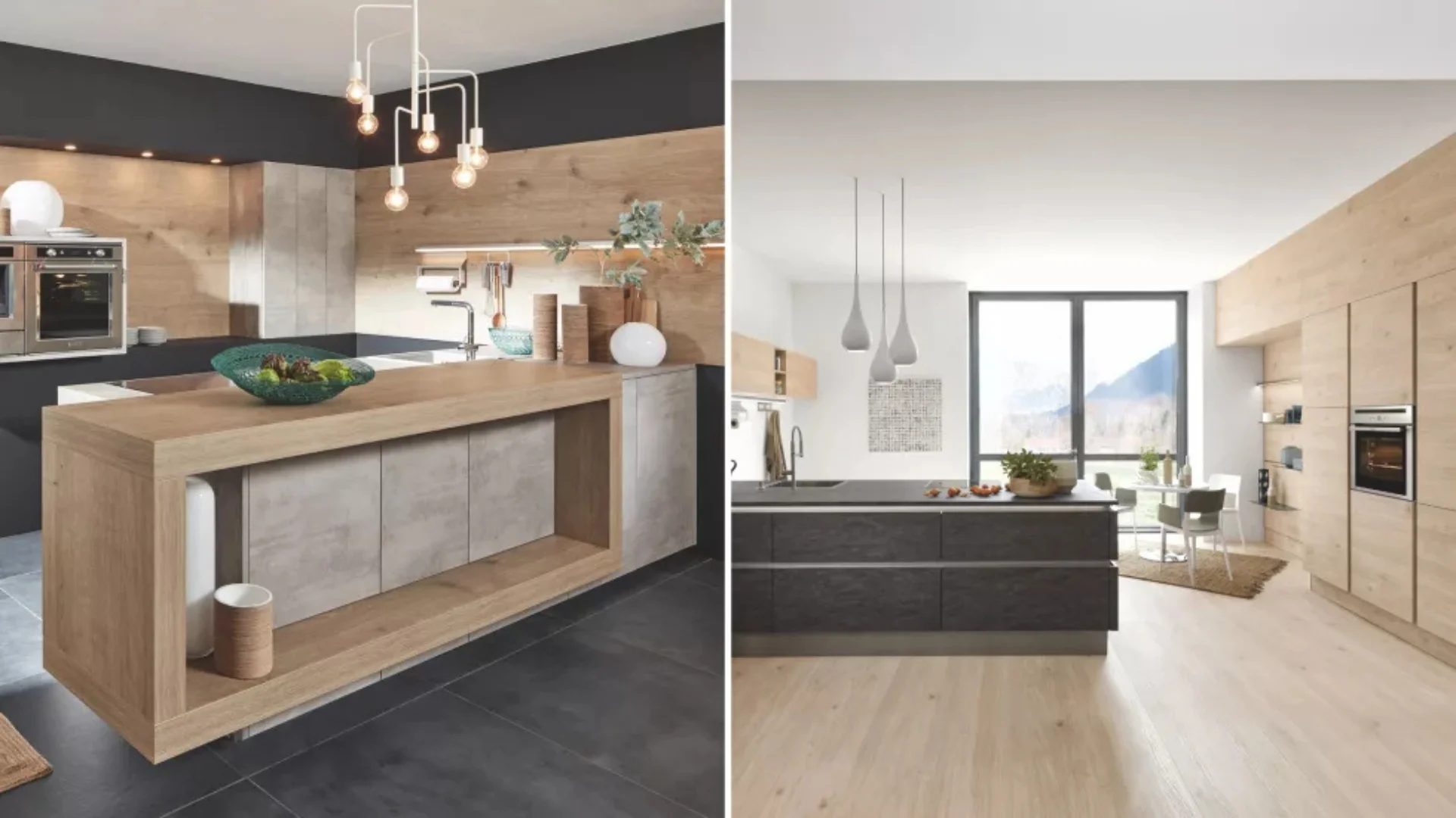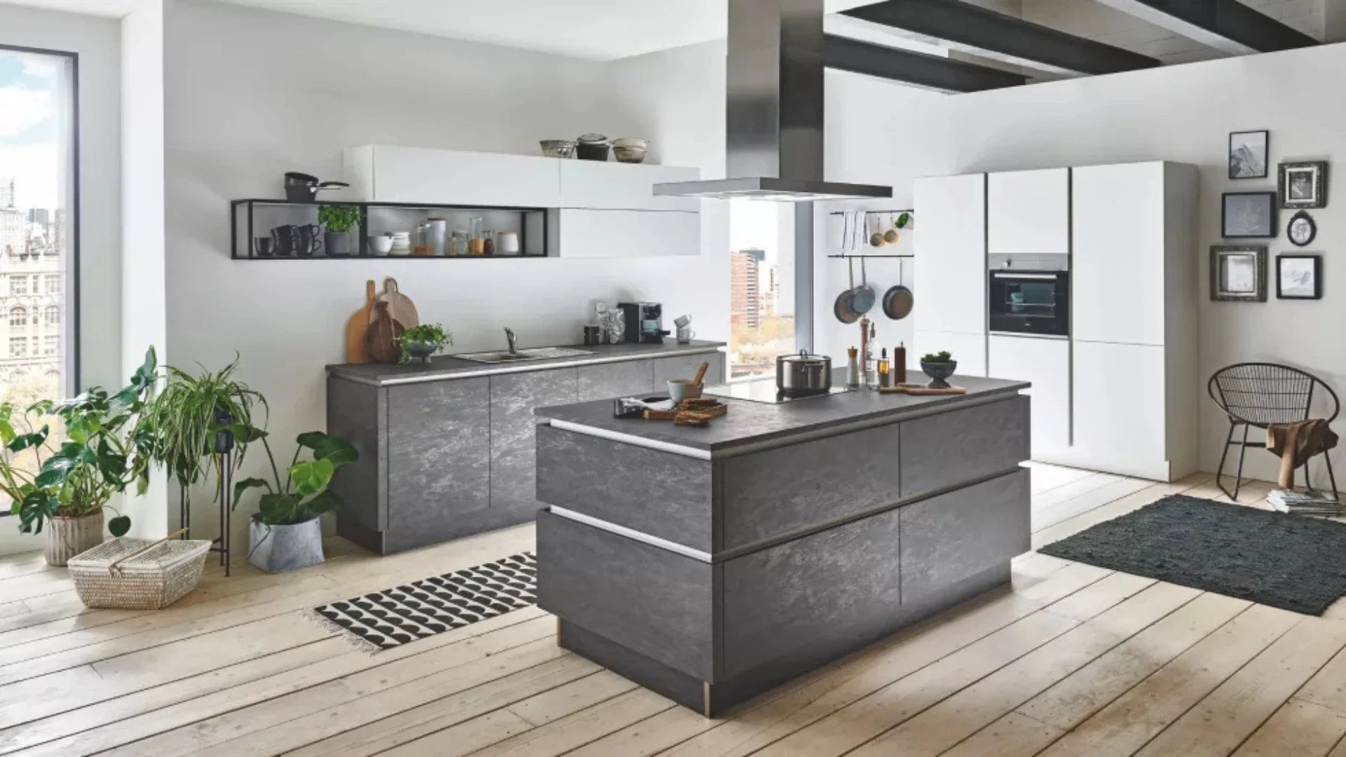 Hier draait alles om contrast. Denk aan betonlook fronten met zwarte handgrepen, rvs-apparaten en open schappen in staal.