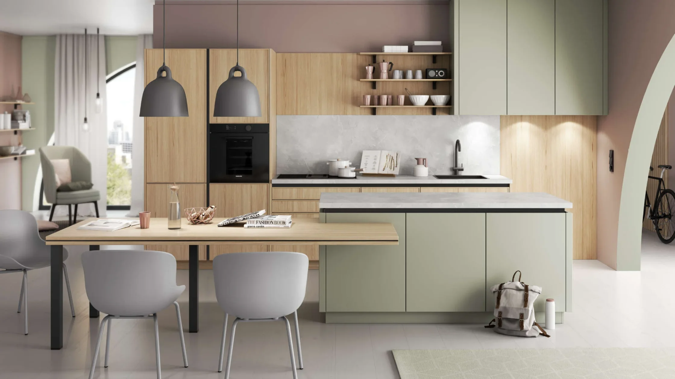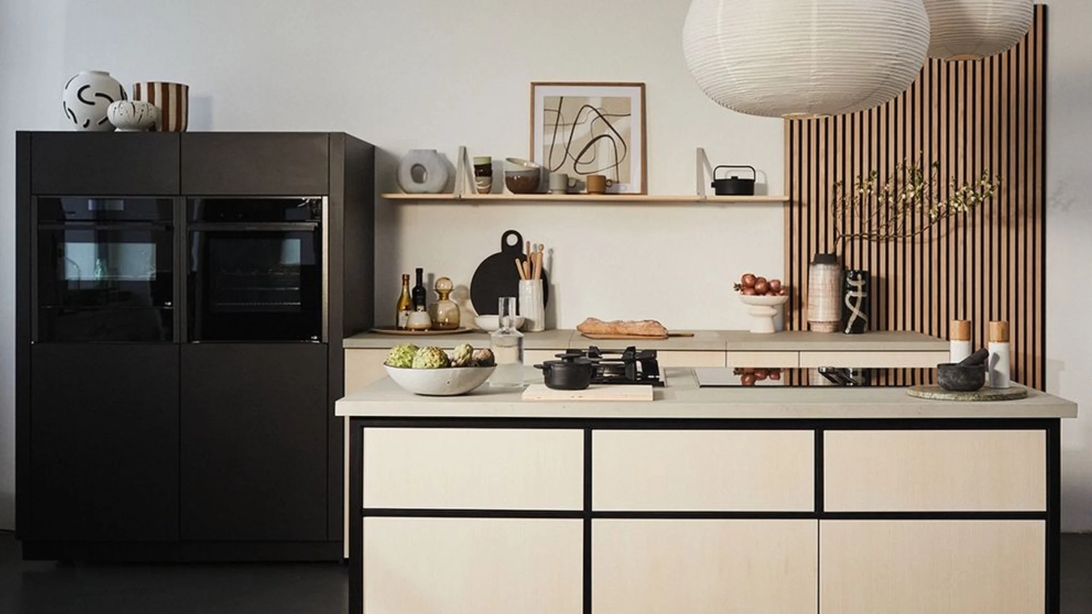 Een minimalistische, maar krachtige uitstraling. Licht hout, zoals essen of eiken, zorgt voor een natuurlijke en warme sfeer, terwijl matzwart een stijlvol contrast geeft. Je kunt deze twee bijvoorbeeld combineren door voor een lichte houtlook keuken te gaan met kastgrepen en kraanwerk in matzwart. Een werkblad in natuursteen maakt het geheel af.