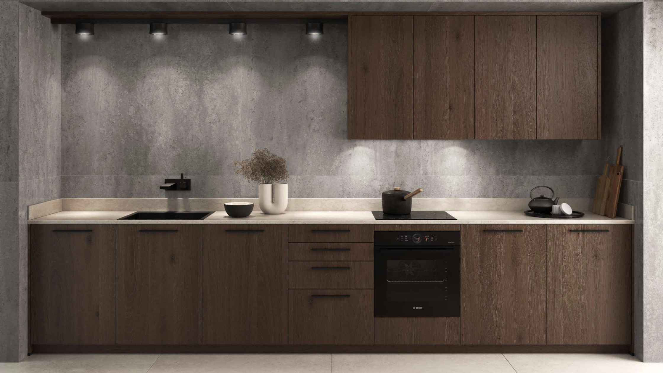 #2 Donker hout gecombineerd met beige en een betonlook werkblad