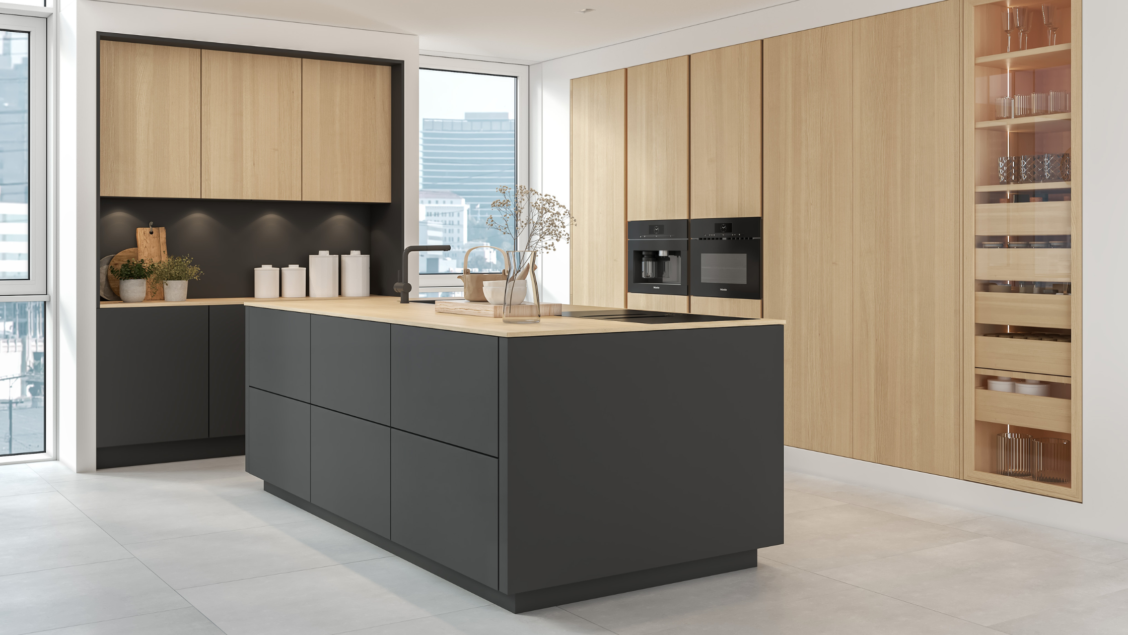 Een minimalistische, maar krachtige uitstraling. Licht hout, zoals essen of eiken, zorgt voor een natuurlijke en warme sfeer, terwijl matzwart een stijlvol contrast geeft. Je kunt deze twee bijvoorbeeld combineren door voor een lichte houtlook keuken te gaan met kastgrepen en kraanwerk in matzwart. Een werkblad in natuursteen maakt het geheel af.