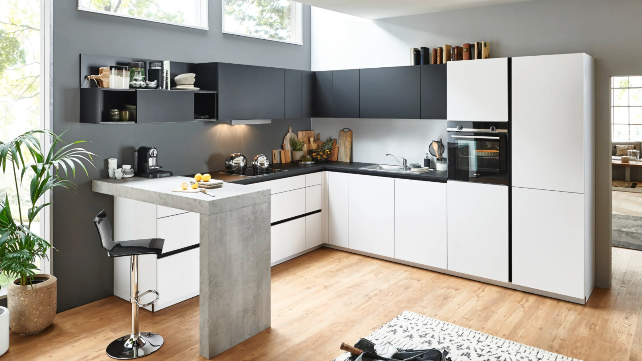 Stylingtip: Voeg houten open planken, groene planten en aardetinten toe om je witte keuken meer sfeer te geven.