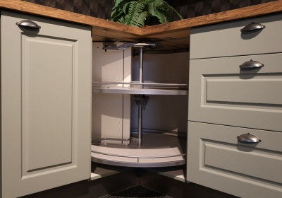 Deze groene landelijke hoekkeuken heeft o.a. kaderfronten, authentieke ladekasten en chrome handvaten, een LeMans carrouselkast, dimbare LED-verlichting onder de 4 bovenkasten en een houtlook werkblad.