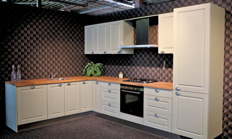 Jubileum Keukendeal 03 Groen Dordrecht. Groene landelijke hoekkeuken met kaderfronten. Deze complete en ontzorgde Groene landelijke hoekkeuken is inclusief inmeten, leveren en montage.