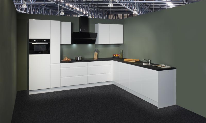 Jubileum Keukendeal 34. Een Strakke Nolte Alpha Lack hoekkeuken. Deze complete en ontzorgde strakke hoogglans witte semi-greeploze keuken is inclusief inmeten, leveren en montage.