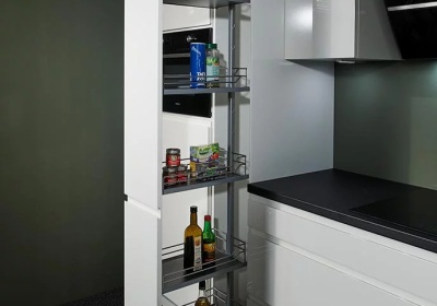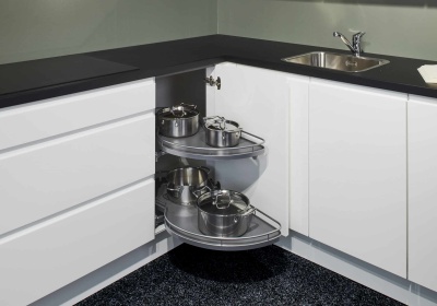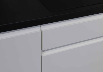 Deze hoogglans witte semi-greeploze keuken heeft o.a. luxe ladekasten met bestekindeling, een LeMans hoekkast en een apothekerskast met extra veel opbergruimte.