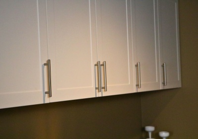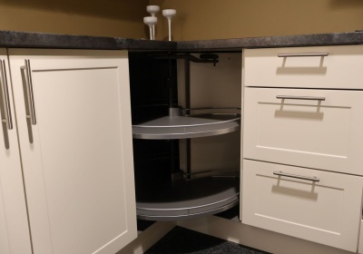 Deze prachtige Nolte witte landelijke hoekkeuken met kaderfronten, 6 hoge kasten met daarin ingebouwde apparatuur, carrouselkast, inductiekookplaat, koelkast en vaatwasser.