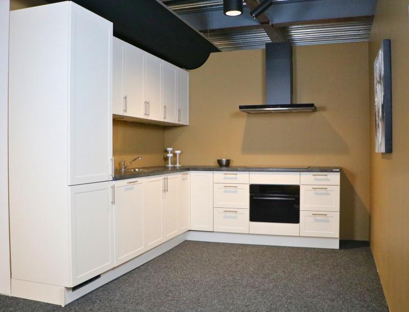 Jubileum Keukendeal 77. Witte landelijke kaderkeuken. Deze complete en ontzorgde witte landelijke hoekkeuken met kaderfronten is inclusief inmeten, leveren en montage.