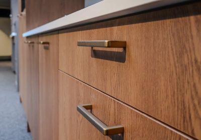 Prachtige houtlook keuken met brede luxe ladekasten, bronze beugelgrepen en gave houtlook fronten.