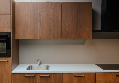 Wordt geleverd met luxe apparatuur (Combi-magnetron, koeler, blokschouw afzuigkap, inductiekookplaat), kraan, spoelbak, aanrechtblad en montagemiddelen.