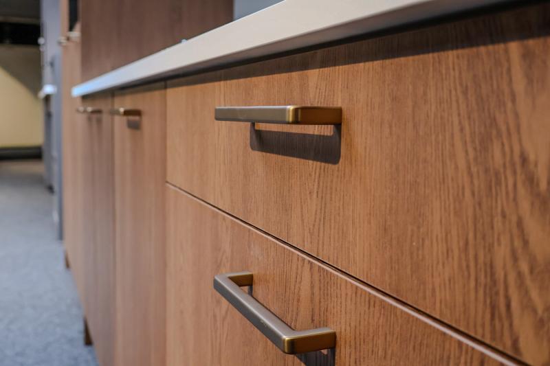 Prachtige houtlook keuken met brede luxe ladekasten, bronze beugelgrepen en gave houtlook fronten.