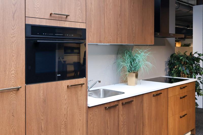 Jubileum Keukendeal 05. Compleet ontzorgde Eiken Cognac houtlook rechte keuken. Inclusief inmeten, leveren en montage!