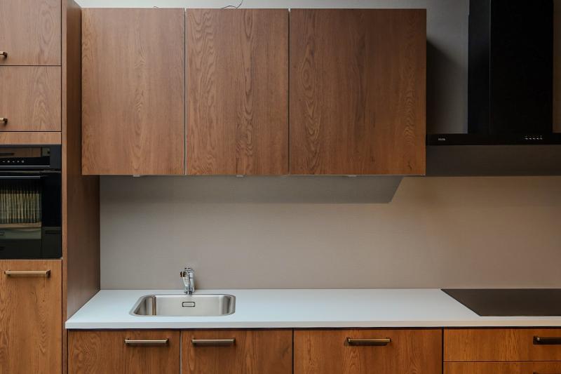 Wordt geleverd met luxe apparatuur (Combi-magnetron, koeler, blokschouw afzuigkap, inductiekookplaat), kraan, spoelbak, aanrechtblad en montagemiddelen.