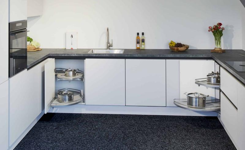 U-keuken met o.a. greeploze fronten, luxe bijpassende blokschouw, en een ruime Le Mans hoekkast.