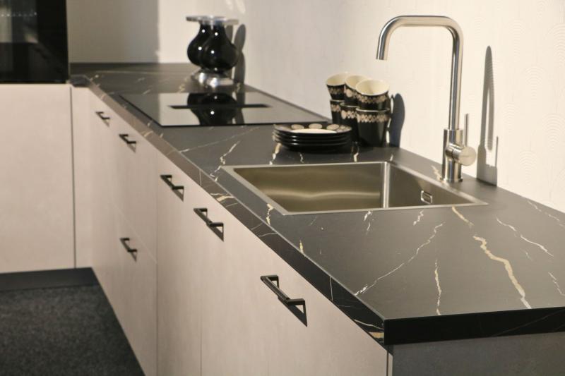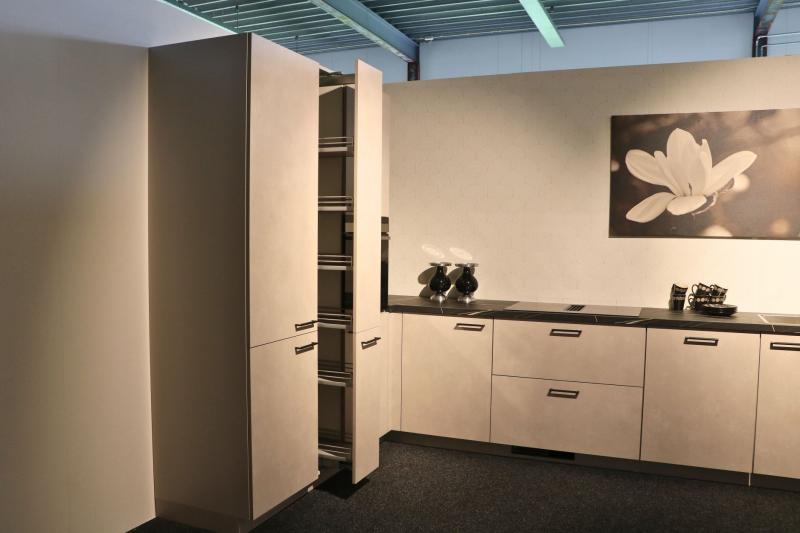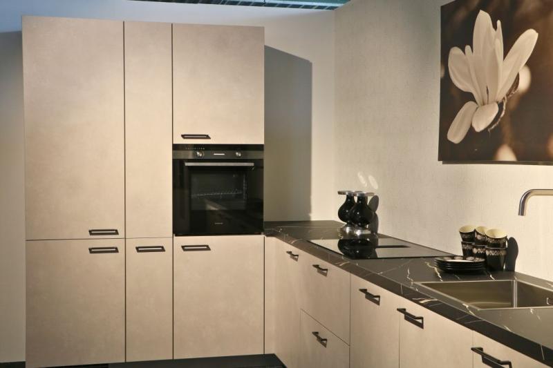 Jubileum keukendeal 19. Compleet ontzorgde Nobilia decor beton zand hoekkeuken met tafel Inclusief inmeten, leveren en montage!