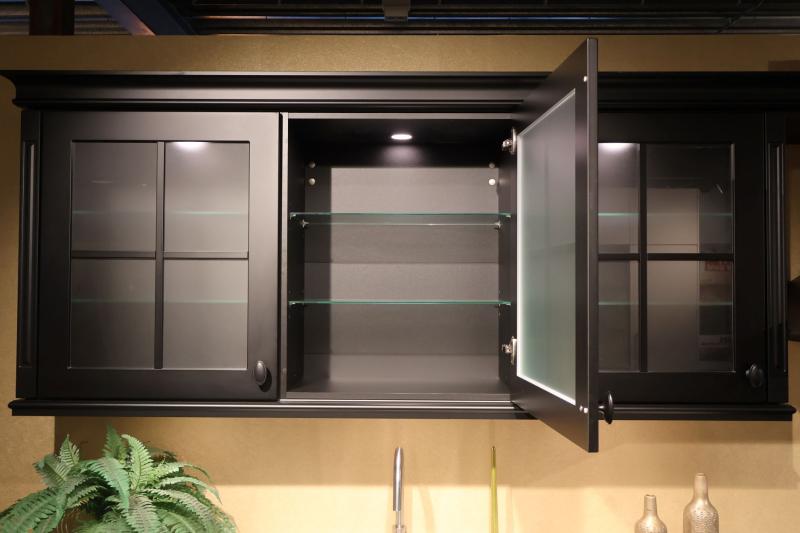 Deze zwarte Landelijke keuken heeft o.a. luxe ladekasten, vaatwasser, fornuis, koelkast, 4 vierkante vitrine kasten en een apothekerskast.