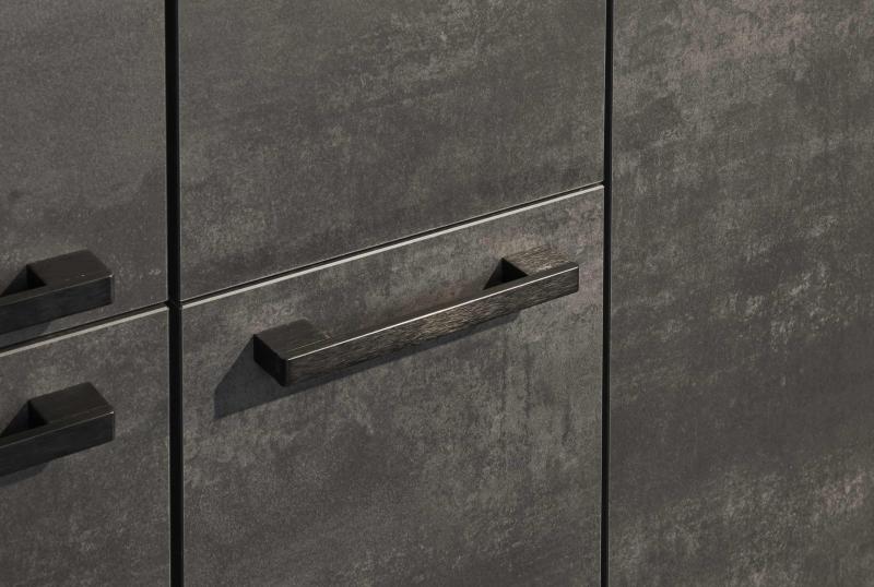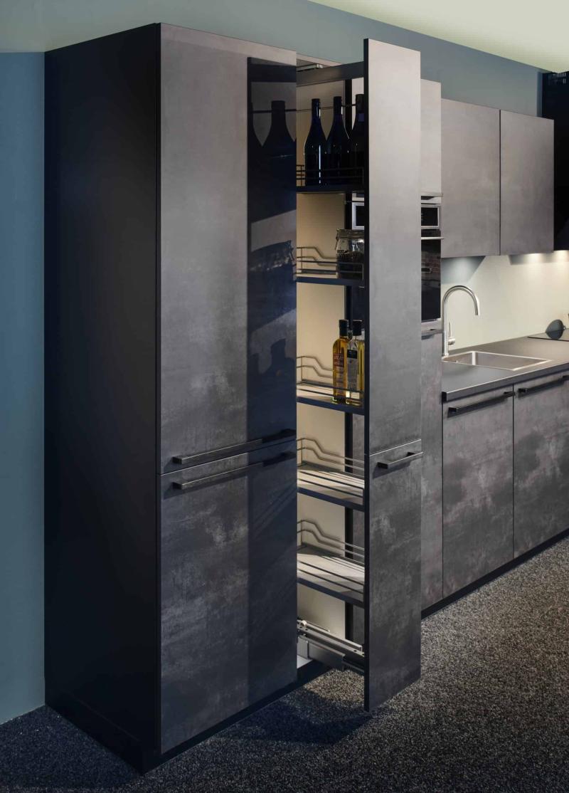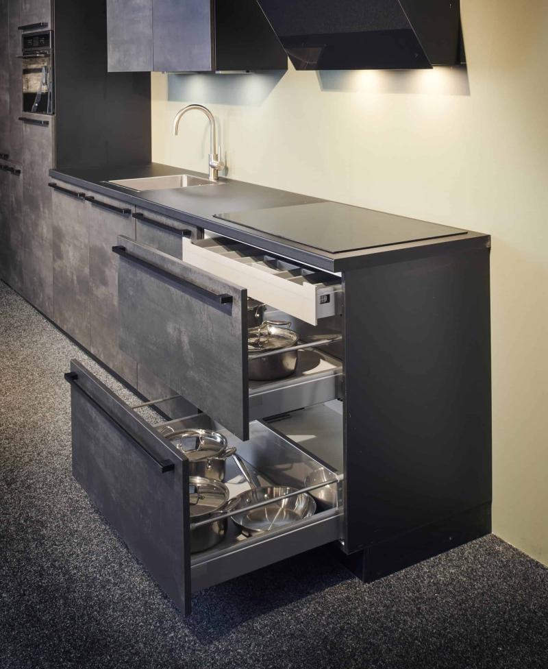 Prachtige rechte keuken, uitgevoerd in zwart beton, model Nobilia 288 speed, met brede donkere RVS grepen