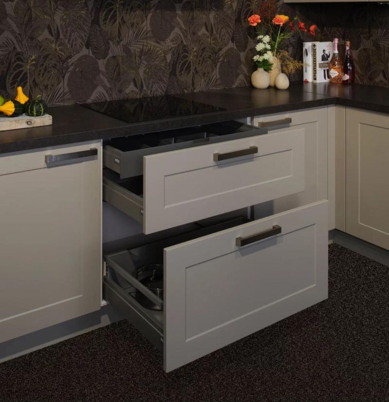 Prachtige kaderkeuken met o.a. luxe ladekasten met binnenlade, Le Mans hoekkast en extra bovenkasten.