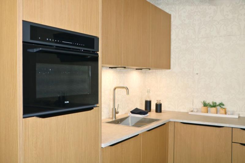 Super compleet met: Etna apparatuur (Brede gaskookplaat, vaatwasser, koeler, Combi-oven, brede diagonale afzuigkap), spoelbak, kraan en montagemiddelen. Ook leverbaar met inductiekookplaat.