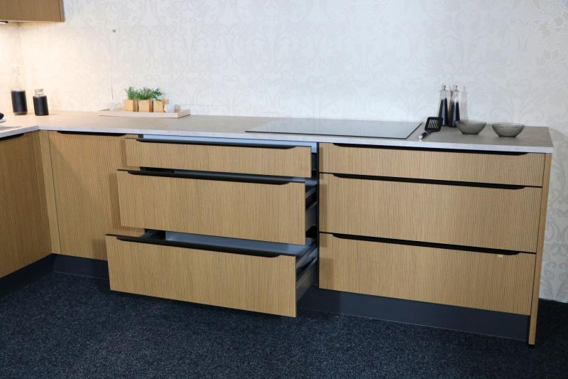 Jubileum Keukendeal 85. Nolte houtlook hoekkeuken. Deze complete en ontzorgde houtlook hoekkeuken is inclusief inmeten, leveren en montage.
