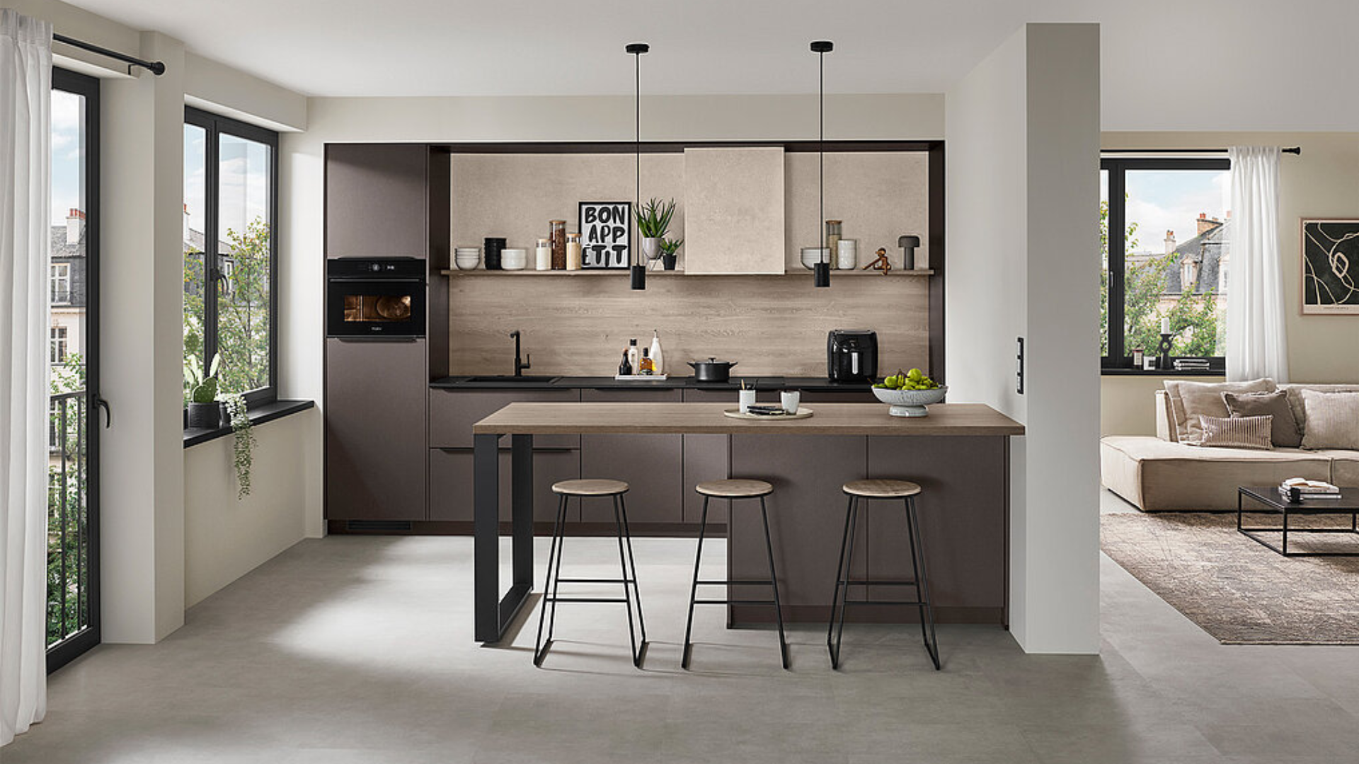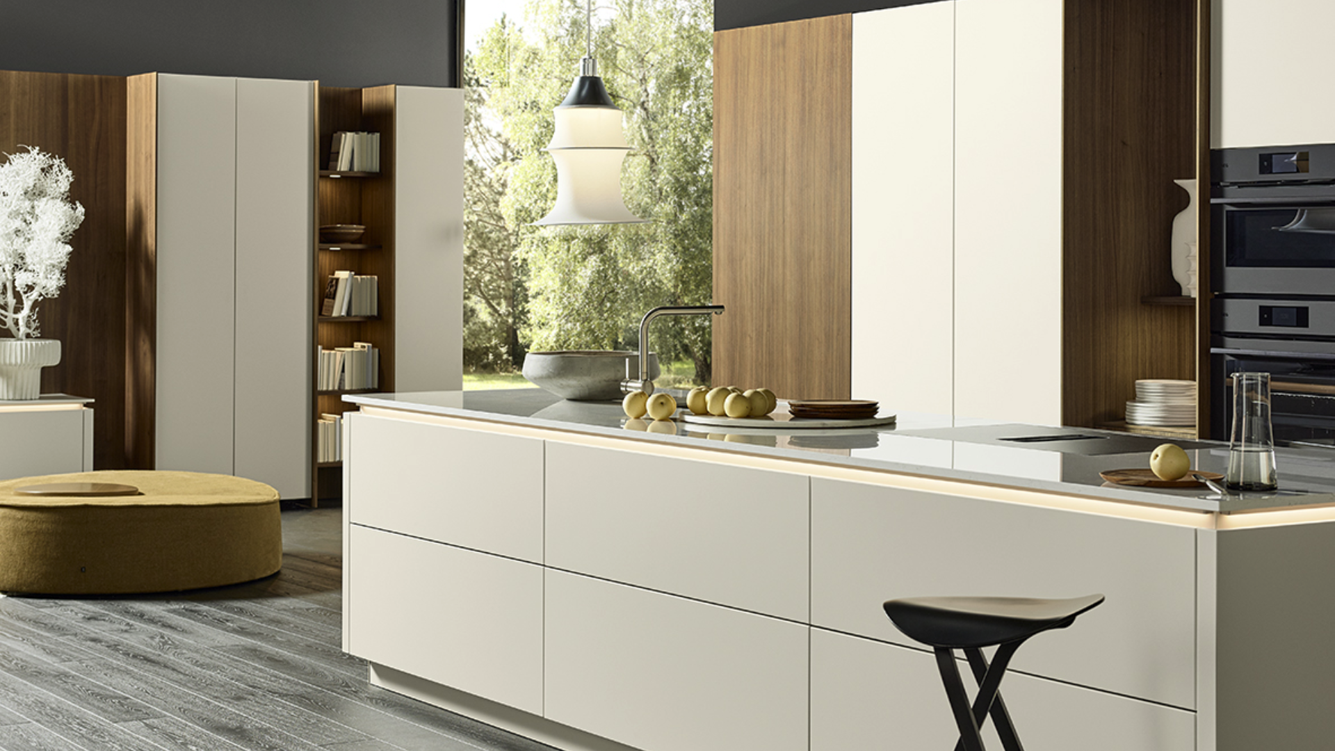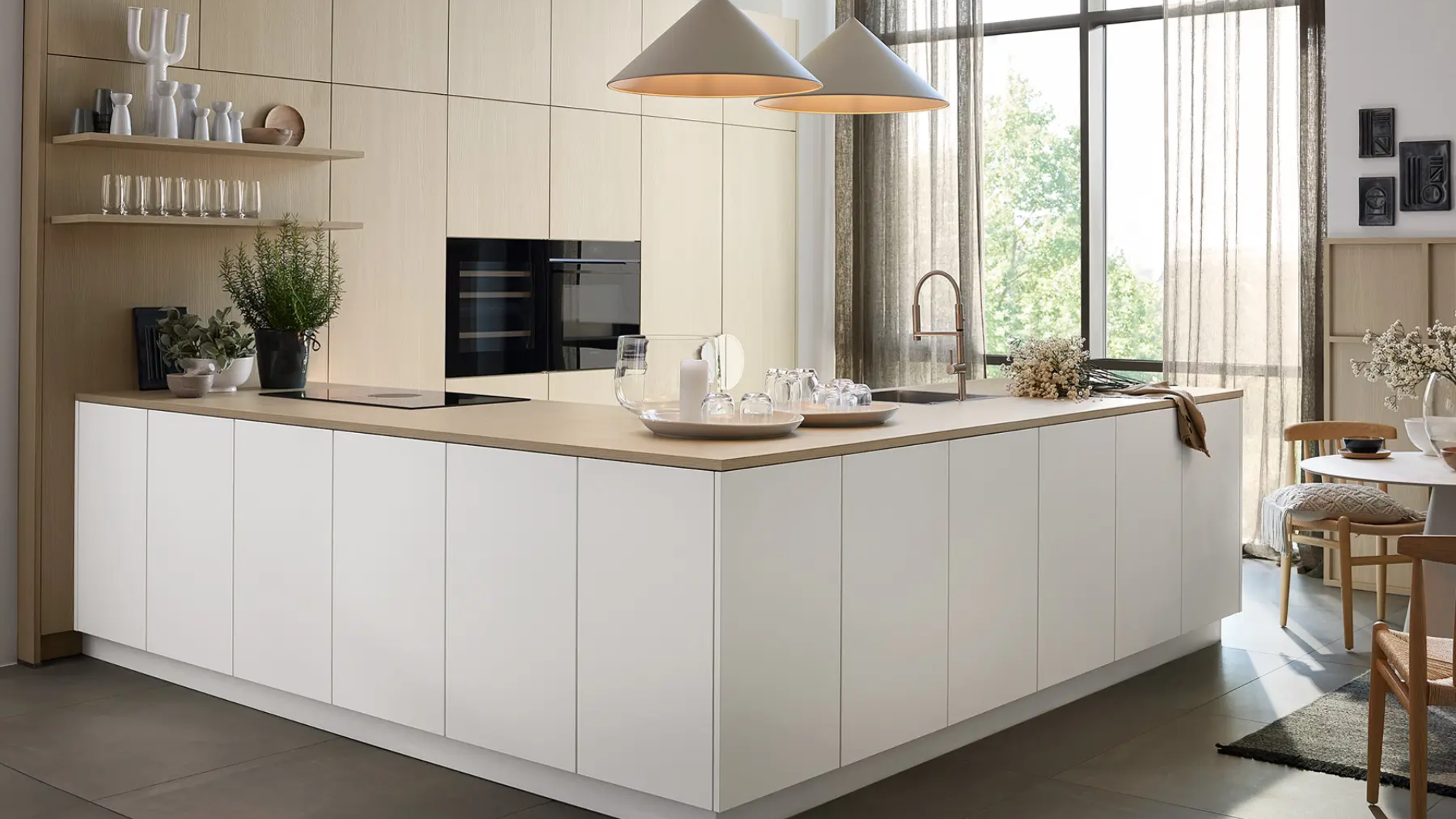 Matte fronten en lichte werkbladen zorgen voor een tijdloze, harmonieuze uitstraling. Combineer bijvoorbeeld een zandkleurige keuken met een licht composiet werkblad of een houten accentwand voor extra diepte en sfeer.