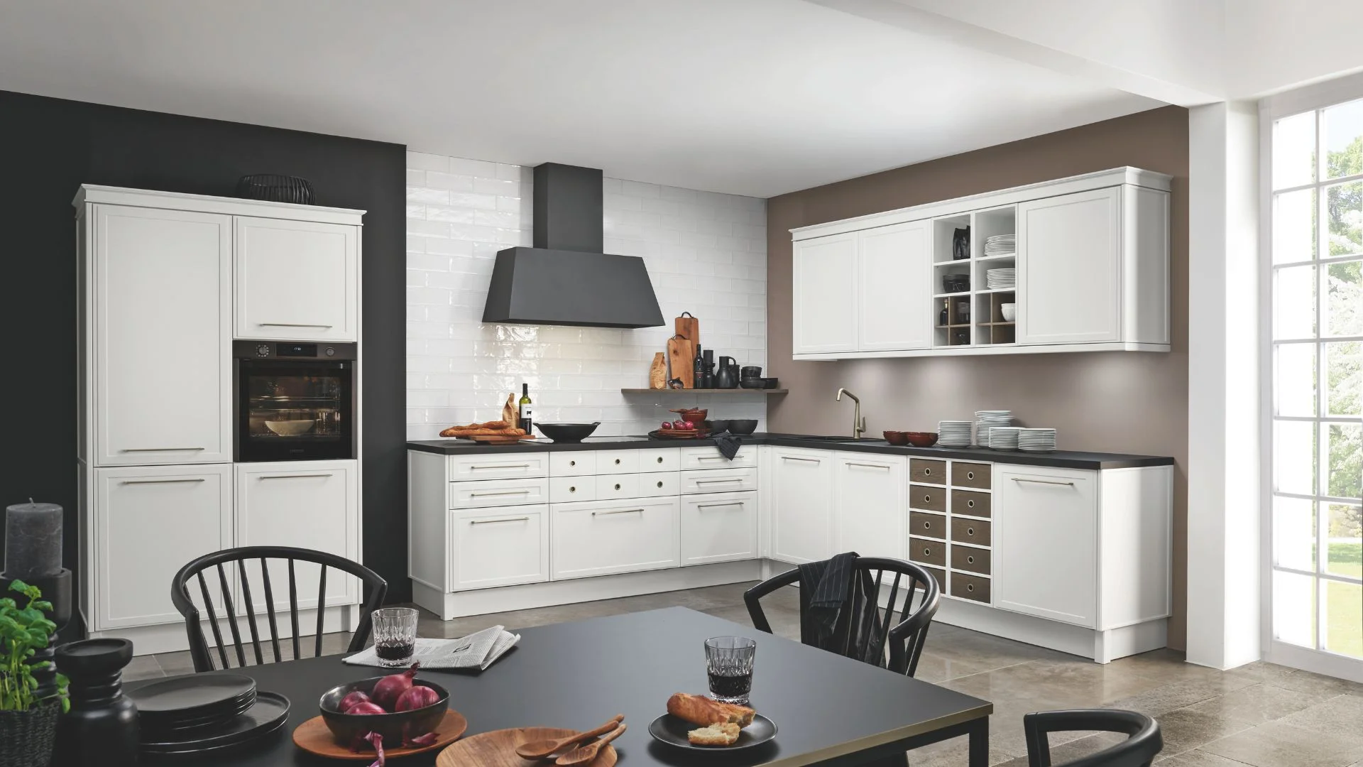 Een L-keuken met raam zorgt voor extra lichtinval, waardoor je keuken nog ruimer en uitnodigend oogt. En met een bar of kastenwand geef je de ruimte nét dat extra beetje comfort en luxe.