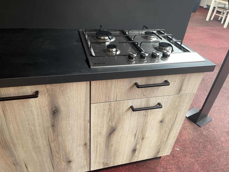 Actie Keuken Kim 103 is uitgevoerd met mooie houtlook deurfronten, met een mooie zwarte handgreep. De lengte van deze keuken is 270 cm.