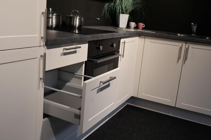 Actie Keuken Lotte 144 is een voorgemonteerde Nolte Eco Faro hoekkeuken uitgevoerd met prachtige magnolia kaderfronten. Hoekkeuken met o.a. mooi kaderfront, luxe ladekast met binnenlade en Le Mans hoekkast.