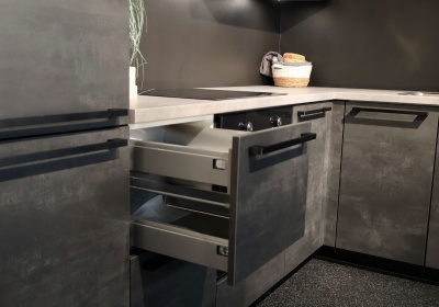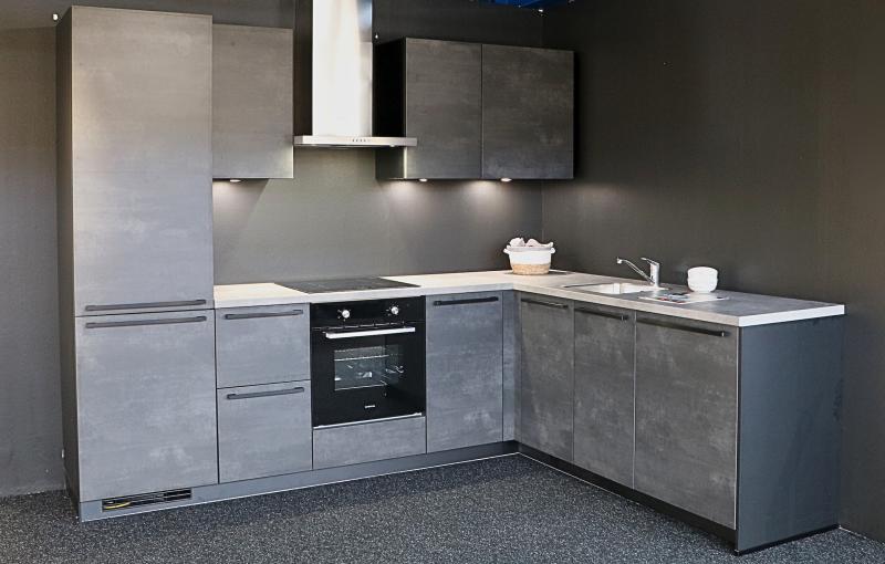 Actie Keuken Evy 114 is een voorgemonteerde Nobilia Laser Beton zwarte hoekkeuken. Met luxe zwarte stanggrepen en greeploze bovenkasten. Hoekkeuken met o.a. luxe ladekast met binnenlade, Le Mans hoekkast en veel opbergruimte. Volledig naar eigen wens aan te passen tegen meer- of minderprijs.