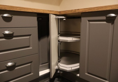 Deze grijze landelijke hoekkeuken heeft o.a. kaderfronten, authentieke ladekasten en chrome handvaten, een LeMans carrouselkast, dimbare LED-verlichting onder de 4 bovenkasten en een houtlook werkblad.