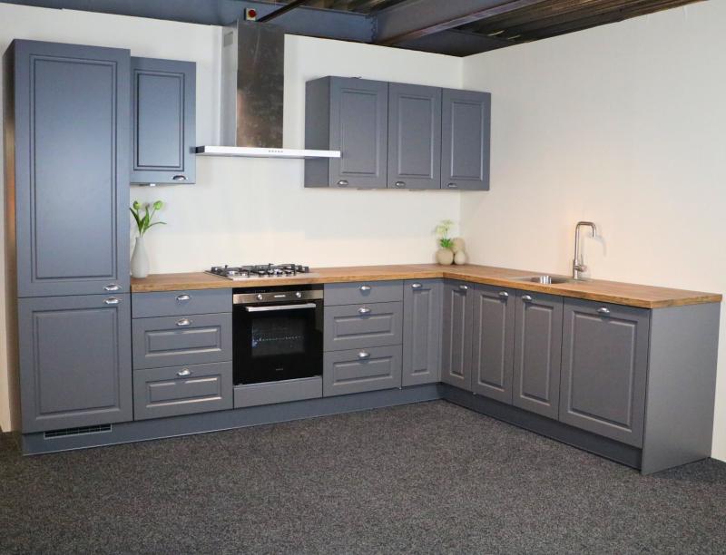 Jubileum Keukendeal 03 Grijs Ter Aar. Grijze landelijke hoekkeuken met kaderfronten. Deze complete en ontzorgde Grijze landelijke hoekkeuken is inclusief inmeten, leveren en montage.