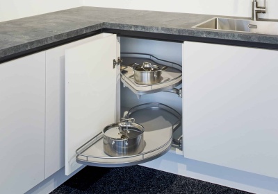 Een LeMans hoekkast maakt slim gebruik van de hoekruimte door middel van uittrekbare en draaibare plateaus die volledig naar buiten komen. Hierdoor heb je makkelijk toegang tot pannen en keukengerei zonder diep in de kast te hoeven reiken.