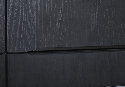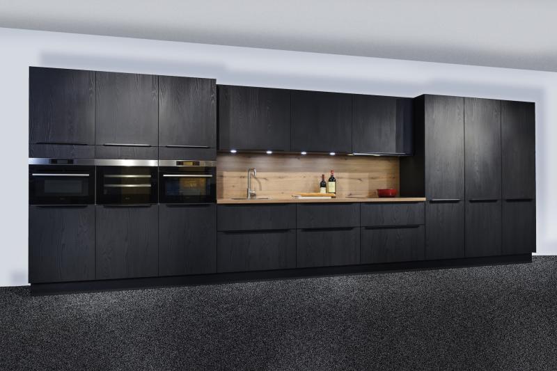 Deze rechte zwarte houtlook keuken van Nolte heeft luxe ladekasten met binnenlade, LED-verlichting onder de vouwklepkasten, hoge kasten met ingebouwde luxe AEG apparatuur met o.a. combi, oven én wijnklimaatkast.