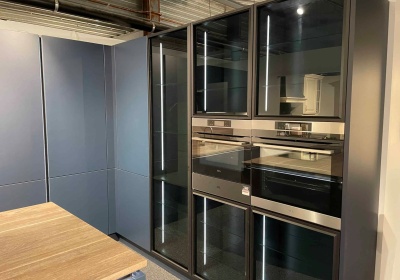 Deze space blauw eiland keuken van Nolte met luxe verlichting heeft o.a. luxe ladekasten, vitrinekasten met verlichting, vaatwasser, koelkast, hoge kasten wand met oven en combi.