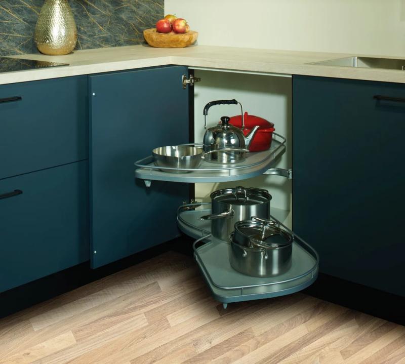 Een LeMans hoekkast maakt slim gebruik van de hoekruimte door middel van uittrekbare en draaibare plateaus die volledig naar buiten komen. Hierdoor heb je makkelijk toegang tot pannen en keukengerei zonder diep in de kast te hoeven reiken.