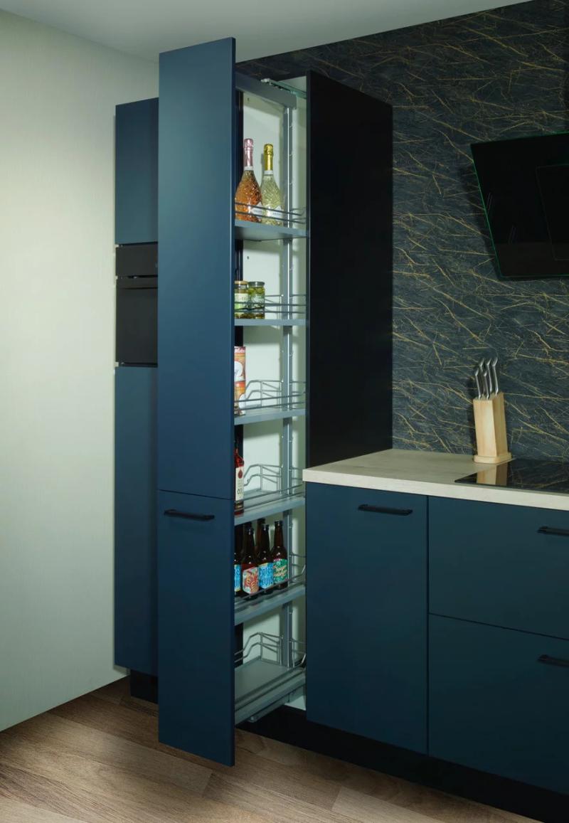 Een apothekerskast is een smalle, volledig uittrekbare kast met overzichtelijke vakken. Ideaal voor het opbergen van kruiden, flessen of voorraadproducten. Alles staat netjes geordend en is in één oogopslag zichtbaar.