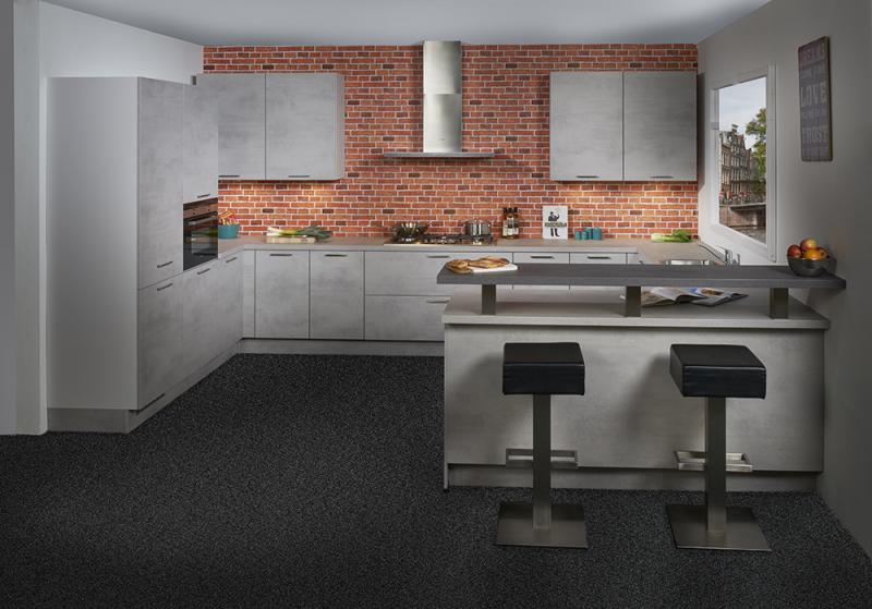 Jubileum Keukendeal 62. Compleet ontzorgde betonlook g-keuken met bar. Inclusief inmeten, leveren en montage!