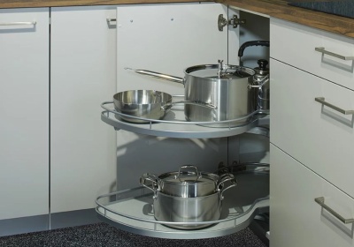 Een LeMans hoekkast maakt slim gebruik van de hoekruimte door middel van uittrekbare en draaibare plateaus die volledig naar buiten komen. Hierdoor heb je makkelijk toegang tot pannen en keukengerei zonder diep in de kast te hoeven reiken.
