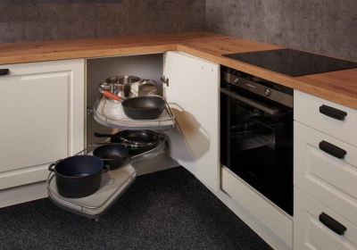 Een LeMans hoekkast maakt slim gebruik van de hoekruimte door middel van uittrekbare en draaibare plateaus die volledig naar buiten komen. Hierdoor heb je makkelijk toegang tot pannen en keukengerei zonder diep in de kast te hoeven reiken.