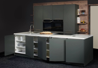 Super compleet met: keramiek eilandblad, luxe apparatuur (inductiekookplaat, vaatwasser, koelkast, oven, combimagnetron), spoelbak, kraan en montagemiddelen.