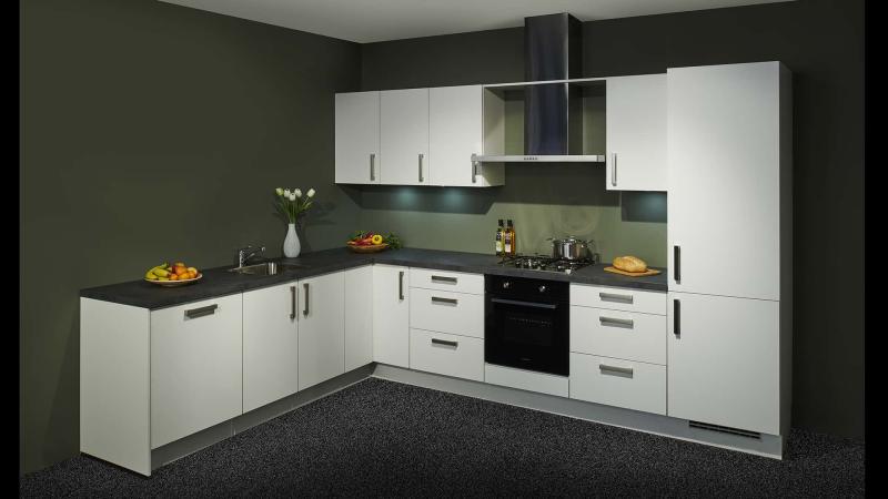 Jubileum Keukendeal 75. Mat witte hoekkeuken, model Laser. Deze complete en ontzorgde mat witte hoekkeuken is Uit voorraad leverbaar inclusief inmeten, leveren en montage.