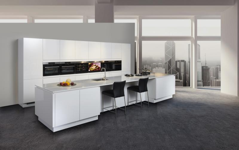 Jubileum Keukendeal 76. Hoogglans witte eilandkeuken. Deze complete en ontzorgde Exclusieve hoogglans witte keuken met keukeneiland is inclusief inmeten, leveren en montage.