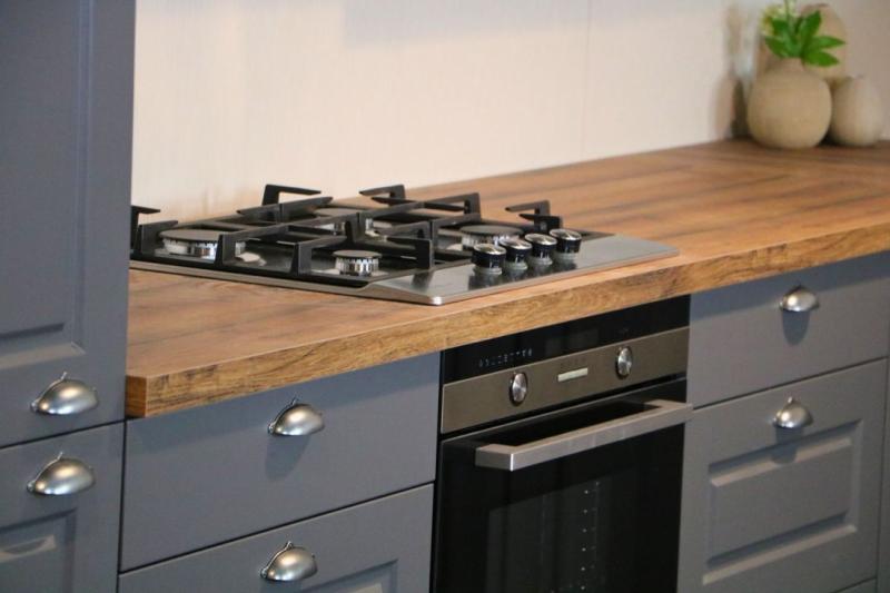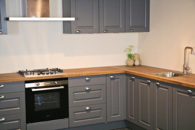 Jubileum Keukendeal 03 Grijs Ter Aar. Grijze landelijke hoekkeuken met kaderfronten. Deze complete en ontzorgde Grijze landelijke hoekkeuken is inclusief inmeten, leveren en montage.